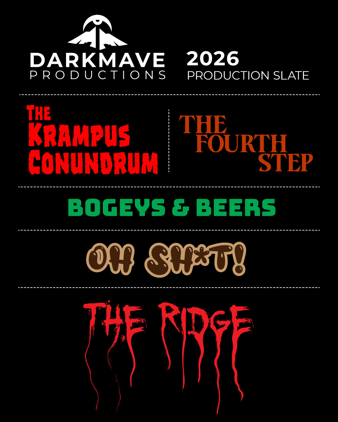 DARKMAVE Productions develops original films and documentaries that live at the intersection of horror, comedy, and real human connection. Our stories are grounded, character-driven, and often place ordinary people in situations that spiral into the strange, the absurd, or the unsettling.